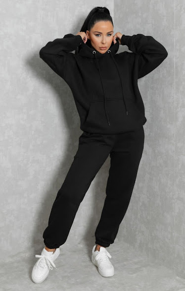 Black Oversized Front Pocket Pullover Hoodie Cuffed Joggers Loungewear Set - Alexia